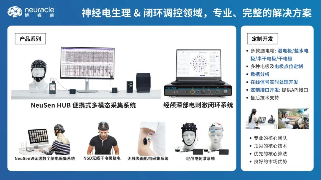公司产品不仅可⼴泛应⽤于神经科学、⼼理学、⼈因⼯程、运动学、管理学等科研领域,还可应⽤于临床神经疾病诊断、治疗与康复⼯程等临床医学领域,研发成果与技术实⼒受到了国内外神经⼯程与临床医学领域专家们的普遍认可。